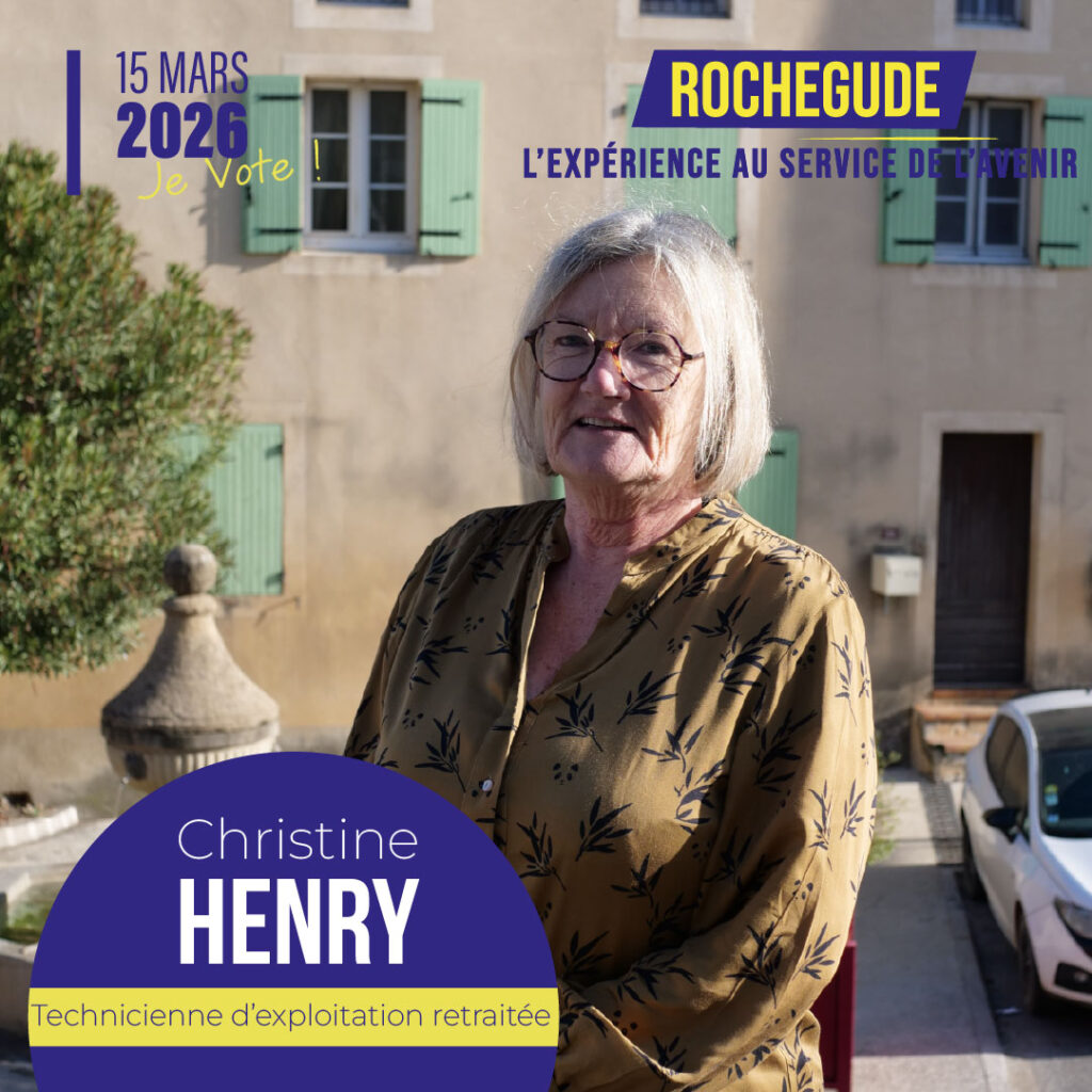 Je m’appelle Christine HENRY, j’ai 67 ans et je vis à Rochegude depuis de nombreuses années, un village auquel je suis profondément attachée. Je suis maman de deux enfants et mariée à Christian, retraité et ancien chef d’entreprise à Rochegude. Ensemble, nous formons un couple heureux de grands‑parents d’un petit‑fils.